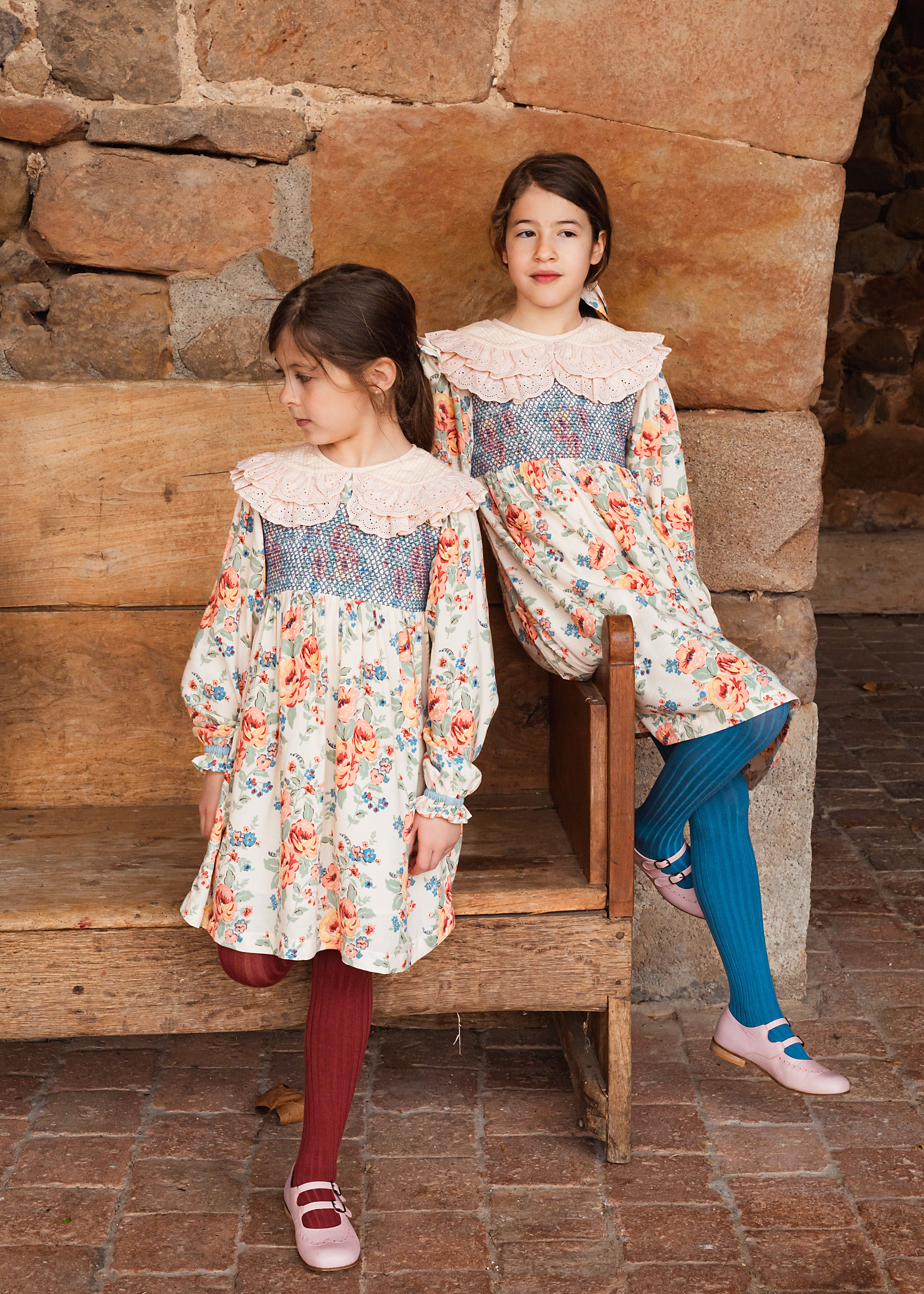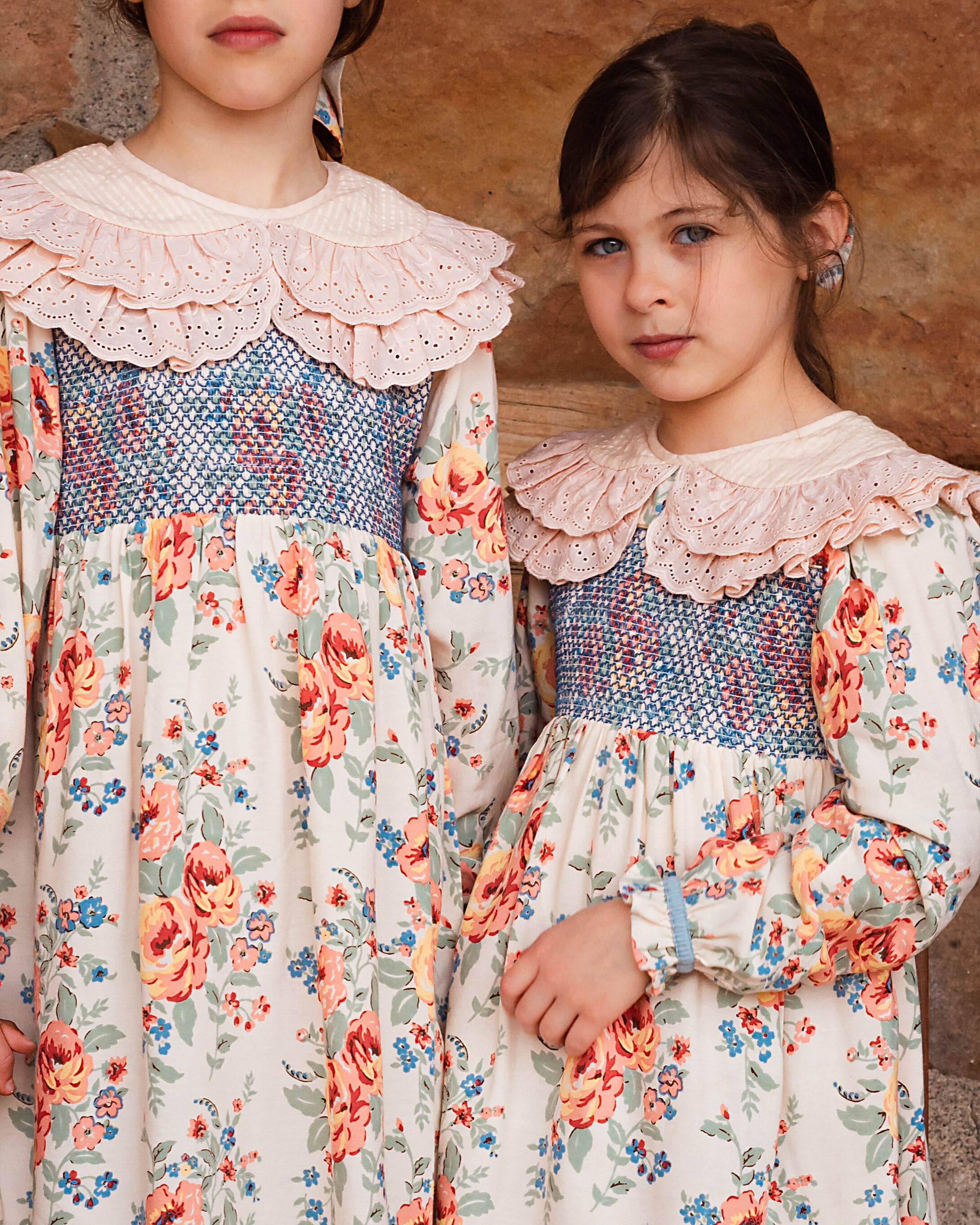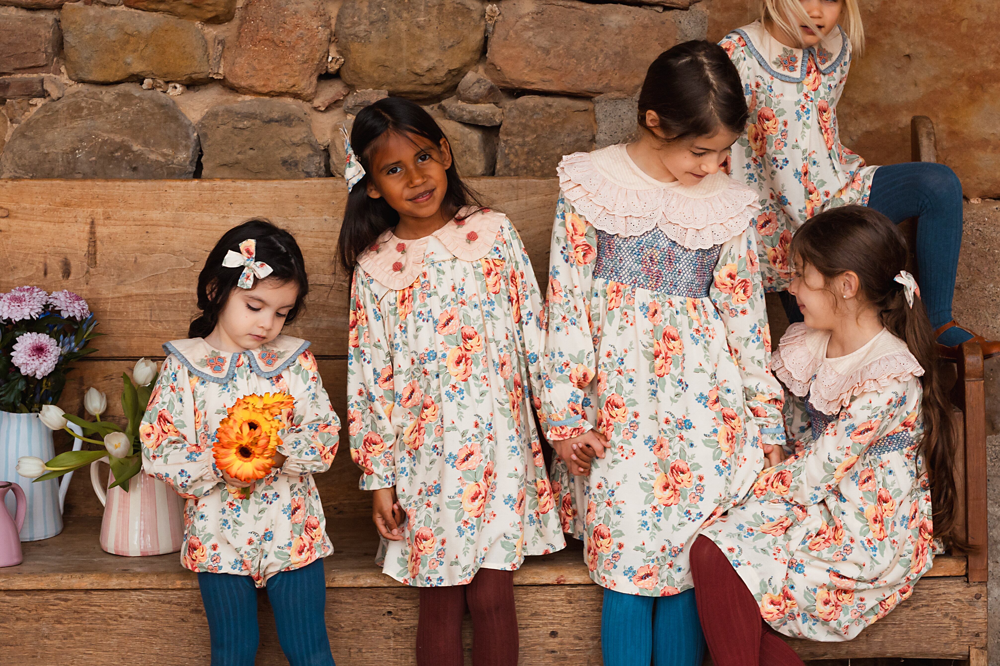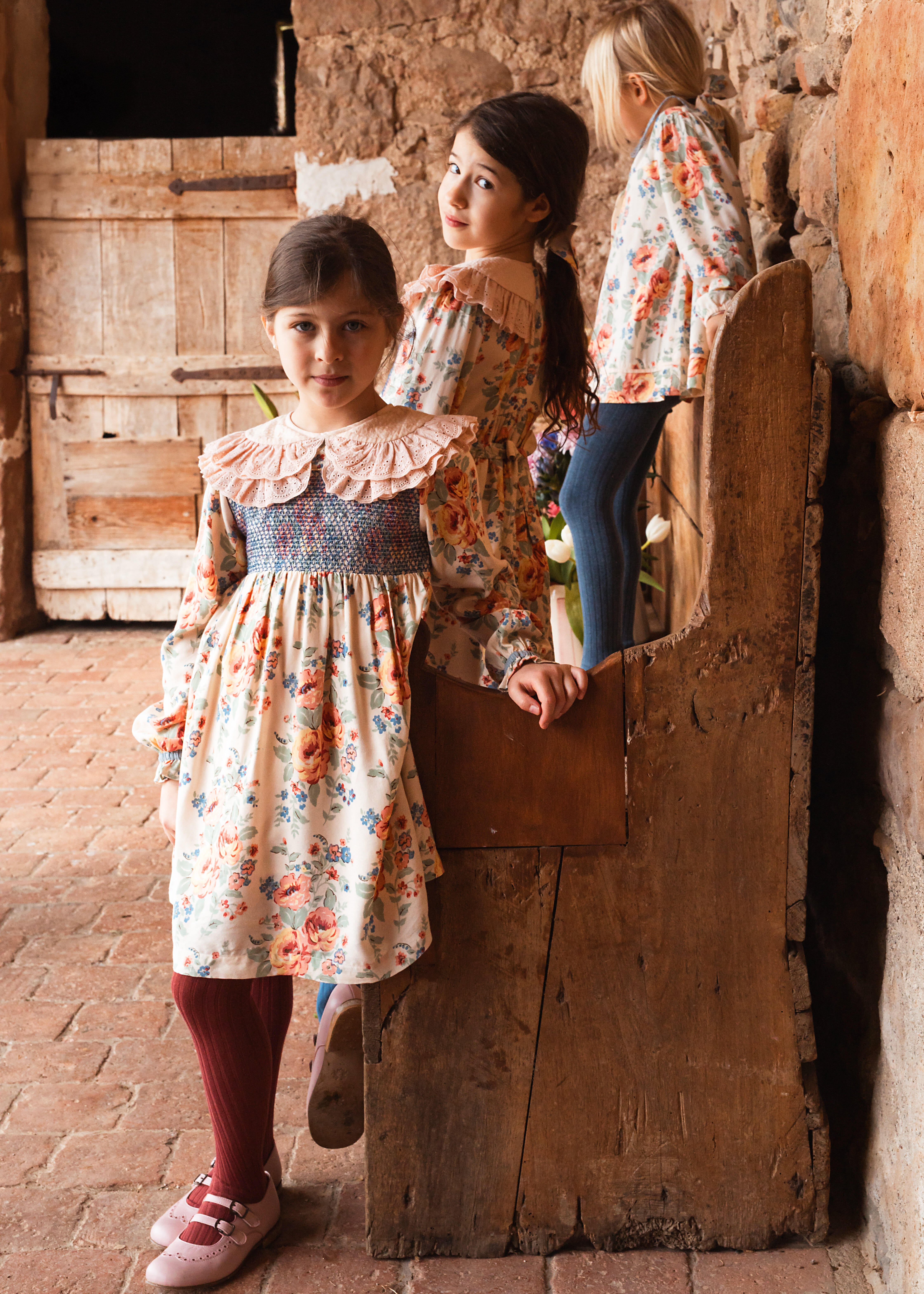 刺繍入りのアングレーズで飾られたダブルピーターパンカラーと、金色のパイピングで仕上げられた美しいスモックを備えたECOVERO®ビスコースのドレス。