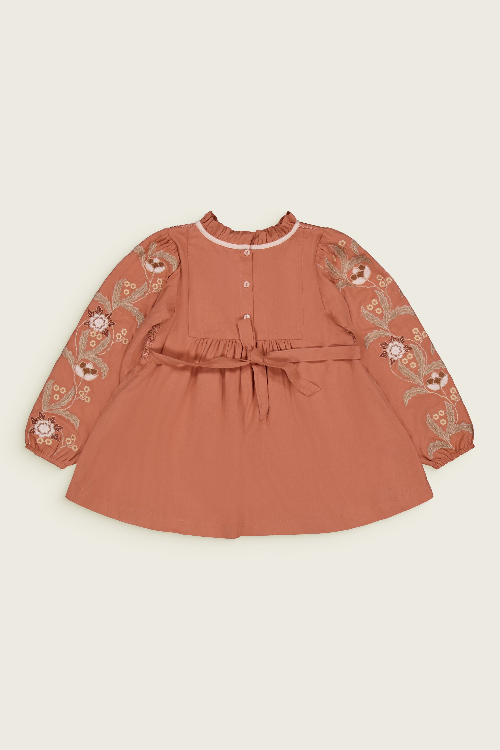 後ろの結ばれたベルトは、お子様の体型に合わせてドレスを調整できます。